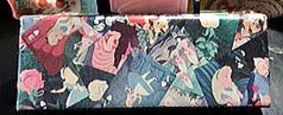 革製で黒い蓋にチェシャ猫がいます。他の面はアリスの絵がいっぱいです。 |
