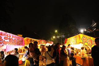| 門前から境内まで夜店が並び、奉納花火、スターマイン |